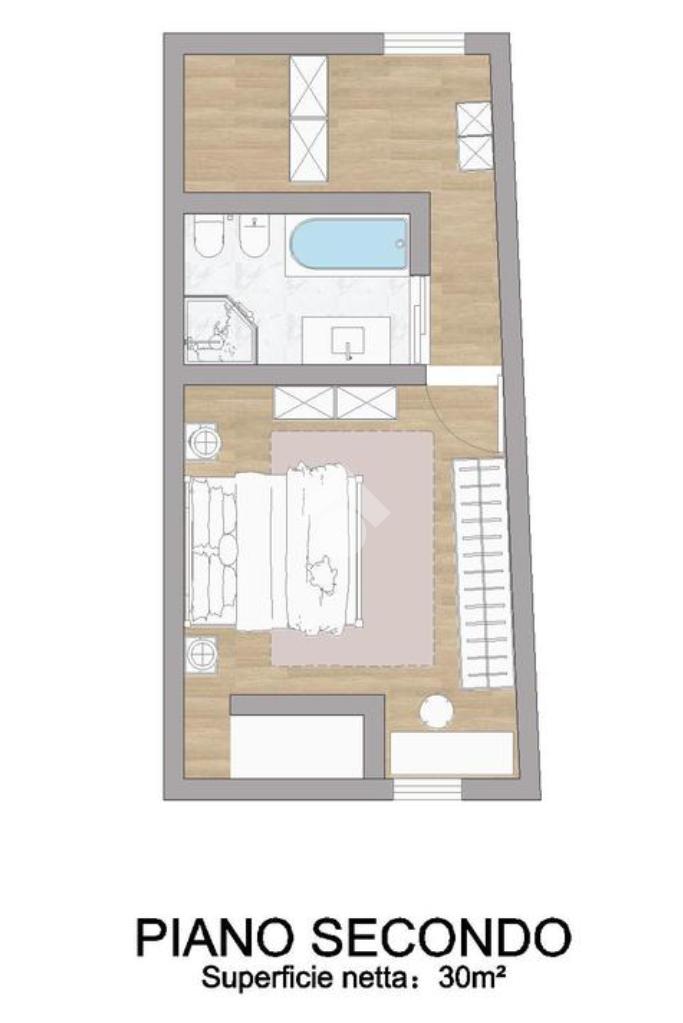Dalla cucina, tramite un'altra scala interna, si arriva alla zona notte composta da una camera matrimoniale, un bagno con vasca e doccia e una piccola zona sottotetto finestrata adibita a ripostiglio.