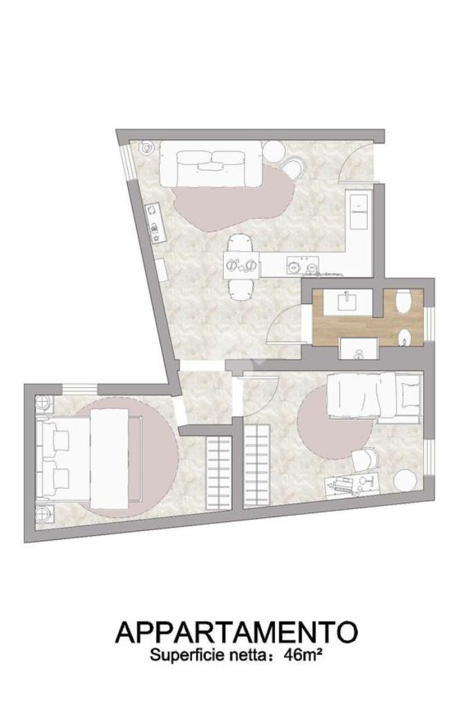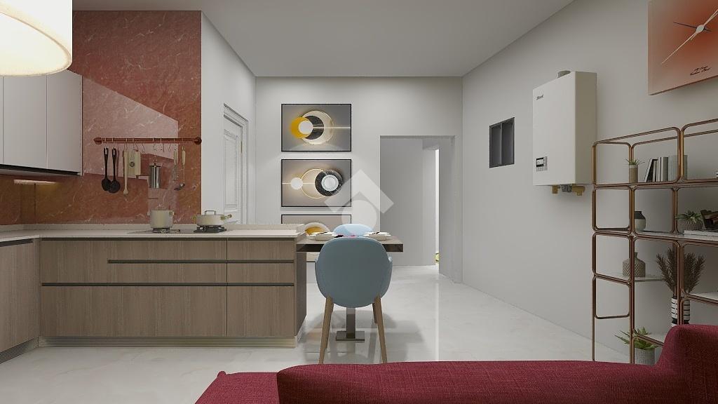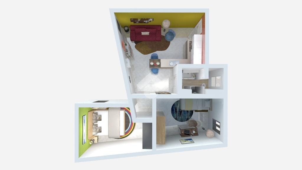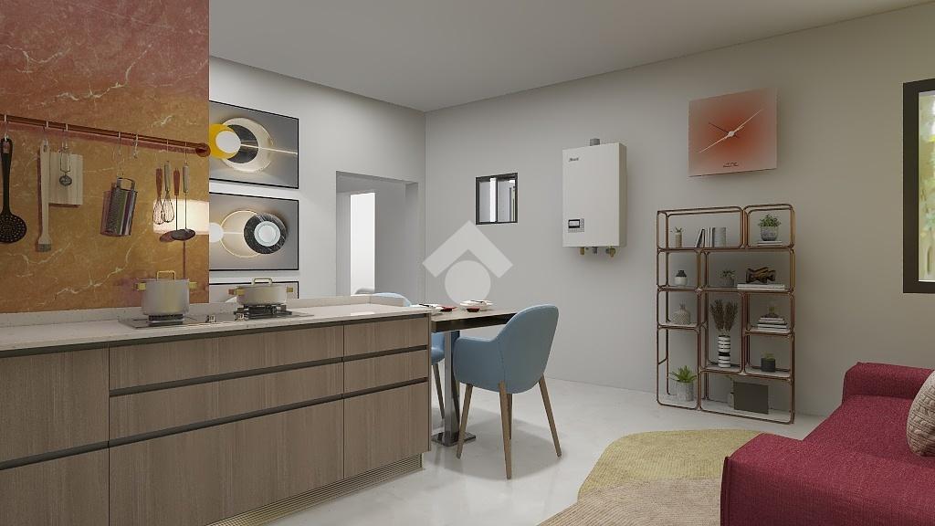 Entrando troviamo un open space con soggiorno e angolo cottura a vista. Proseguendo vi è il bagno con doccia in muratura e finestra. Tramite un disimpegno si arriva alla camera matrimoniale e alla cameretta.