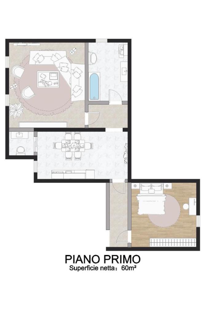 Entrando al piano terra troviamo una cantina. Al piano primo il primo appartamento, composto da camera, cucina abitabile con piccolo wc di servizio, altra camera con doppia finestra utile come soggiorno e bagno con finestra e vasca.