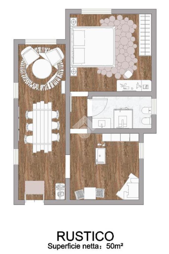 Il rustico è composto da un lungo soggiorno con tre grandi finestre adibito a sala da pranzo, una cucina abitabile con camino, un bagno con finestra e doccia e una spaziosa camera matrimoniale.