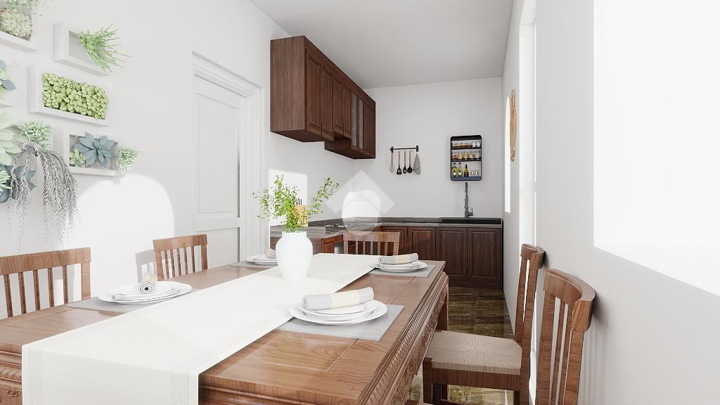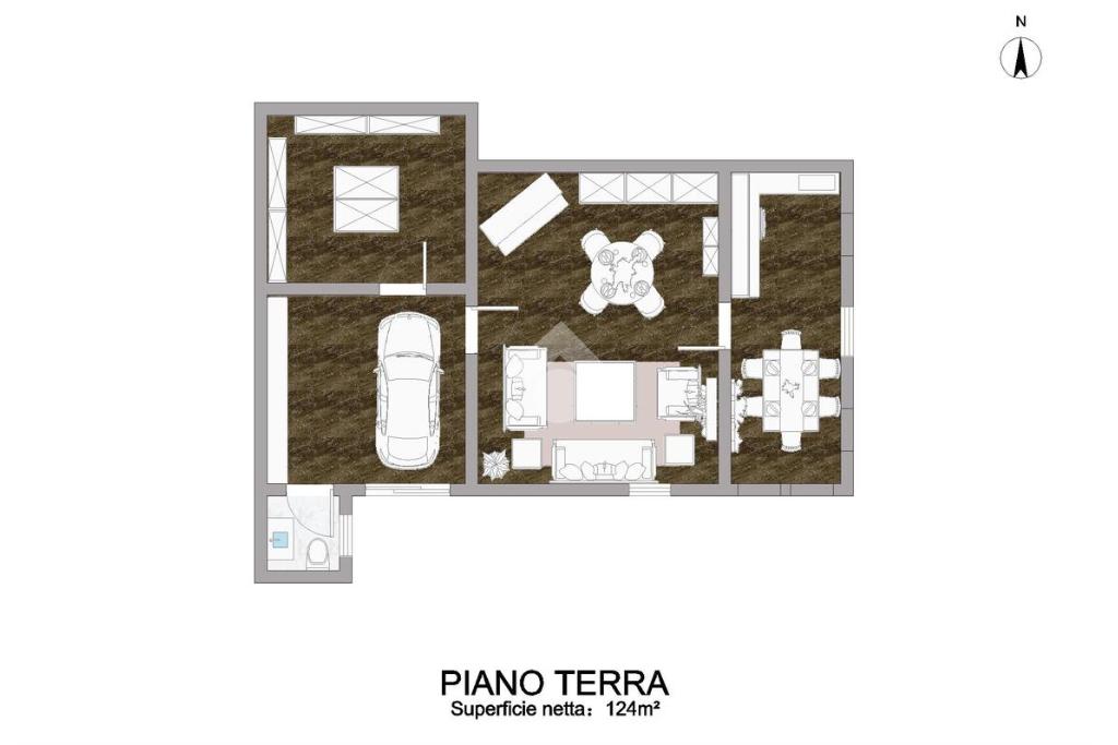 La soluzione si sviluppa su due livelli. Al piano terra troviamo una cucina e un ampio soggiorno con camino, oltre a un locale magazzino con bagno collegato al salone e una legnaia.